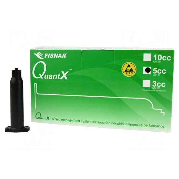 Korpus strzykawki o pojemności 5 ml przeznaczony do systemów dozowania QuantX. Element wykonany z polipropylenu w kolorze czarnym, w wersji bezsilikonowej oraz ESD, co zapewnia odpowiednie właściwości przy pracy z komponentami wrażliwymi na wyładowania elektrostatyczne.