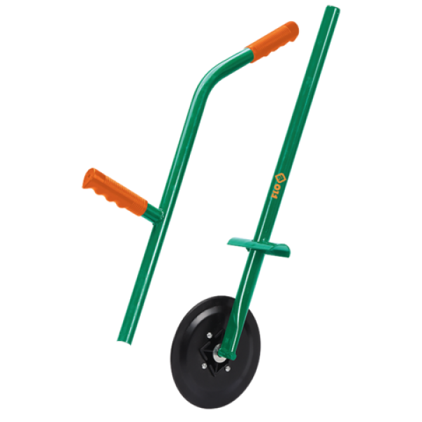 Krawędziarka do przycinania brzegów trawnika. Konstrukcja posiada długi drążek, podnóżek dociskowy i rączkę PVC.