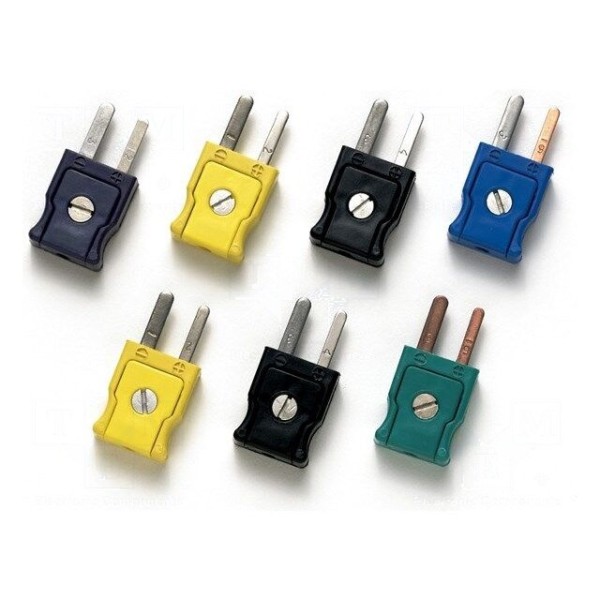 Zestaw złącz pomiarowych przeznaczony do współpracy z urządzeniami termometrycznymi. Komplet zawiera różne standardy złączy, umożliwiając podłączenie sond termoparowych typu J, K, R/S oraz T. W zestawie: 2 sztuki złącza typu J (kolor czarny), 2 sztuki złącza typu K (kolor żółty), 1 sztuka złącza typu R/S (kolor zielony) oraz 1 sztuka złącza typu T (kolor niebieski). Elementy zostały zaprojektowane do wykorzystania w zaawansowanych pracach pomiarowych w technice przemysłowej.