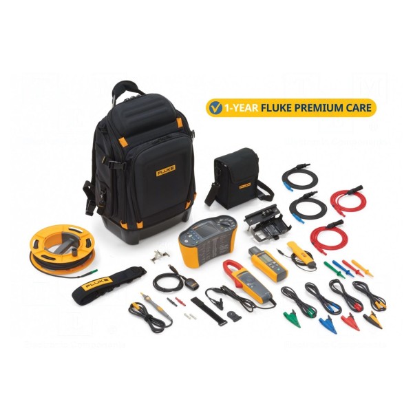 W zestawie: adapter, analizator, bezpieczniki, cęgi prądowe FLK-I100, Fluke Premium Care (1 rok), miernik promieniowania słonecznego FLK-IRR2-BT, pasek do przenoszenia, plecak, przewód na szpuli TL1000/30M, przewód USB, przewody pomiarowe TL1000, przewody pomiarowe TL1000-MC4, sonda pomiarowa, sonda temperaturowa FLK-80PR-IRR, sonda ze zdalnym sterowaniem TP1000, torba ochronna, wspornik montażowy, zaczep magnetyczny oraz zestaw złącz.