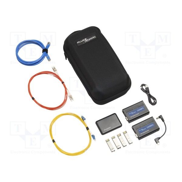 W zestawie: futerał, kabel krosowy RJ45, kabel USB, kable światłowodowe jednomodowe, kable światłowodowe wielomodowe, konwerter do nośnika światłowodowego 1 Gb/s, konwerter do nośnika światłowodowego 10 Gb/s, moduł światłowodowy SFP x4 oraz powerbank. Kompletny zestaw zapewnia niezbędne wyposażenie do pracy w terenie oraz w warunkach laboratoryjnych.