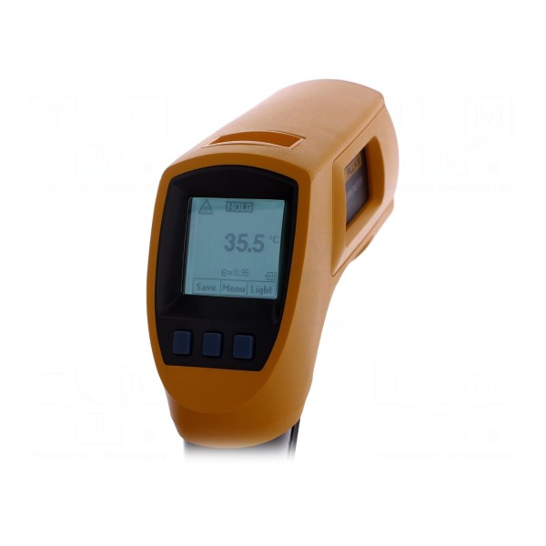 Pirometr umożliwia bezdotykowy pomiar temperatury w zakresie od –40°C do 800°C z rozdzielczością optyczną 50:1. Urządzenie wspiera również pomiar dotykowy za pomocą sondy typu K w szerokim zakresie od –270°C do 1372°C. Dokładność pomiaru wynosi ±1%, ±1°C dla obu metod, przy rozdzielczości pomiaru bezdotykowego na poziomie 0,1°C oraz czasie reakcji poniżej 0,5 s. Wartość emisyjności jest regulowana w zakresie od 0,1 do 1 z rozdzielczością 10m.