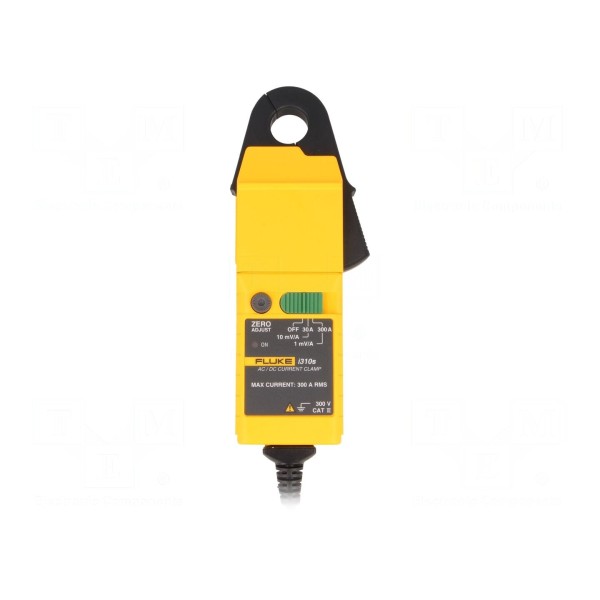 Przystawka cęgowa AC/DC umożliwia pomiar prądu zmiennego w zakresach 30A i 300A oraz prądu stałego w zakresach 45A i 450A. Urządzenie charakteryzuje się dokładnością pomiaru na poziomie ±1% zarówno dla prądu AC, jak i DC. Maksymalna średnica mierzonego przewodu wynosi 19mm, a dopuszczalne napięcie pracy przyrządu to 300V.