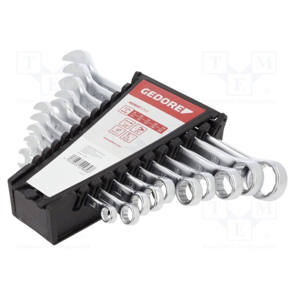 Zestaw zawiera 10 sztuk kluczy płasko-oczkowych dwustronnych o zróżnicowanych rozmiarach: 8mm, 10mm, 11mm, 12mm, 13mm, 14mm, 15mm, 17mm, 19mm oraz 22mm. Narzędzia zostały wykonane ze stali chromowo-wanadowej, a ich powierzchnia została pokryta chromem w celu zabezpieczenia przed korozją. Konstrukcja kluczy jest zgodna z normami DIN 3113, ISO 3318 oraz ISO 7738.