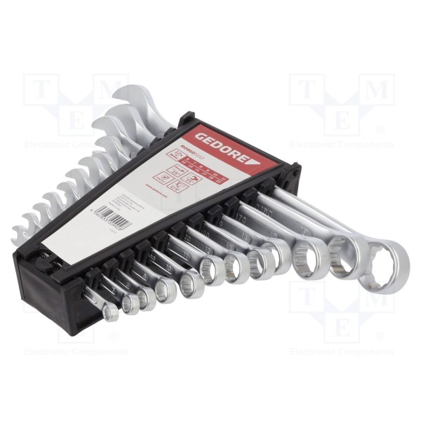 Zestaw obejmuje 12 dwustronnych kluczy płasko-oczkowych wykonanych ze stali chromowo-wanadowej. Powierzchnia narzędzi została pokryta warstwą chromu, co wpływa na ich trwałość podczas codziennej eksploatacji w warsztacie.