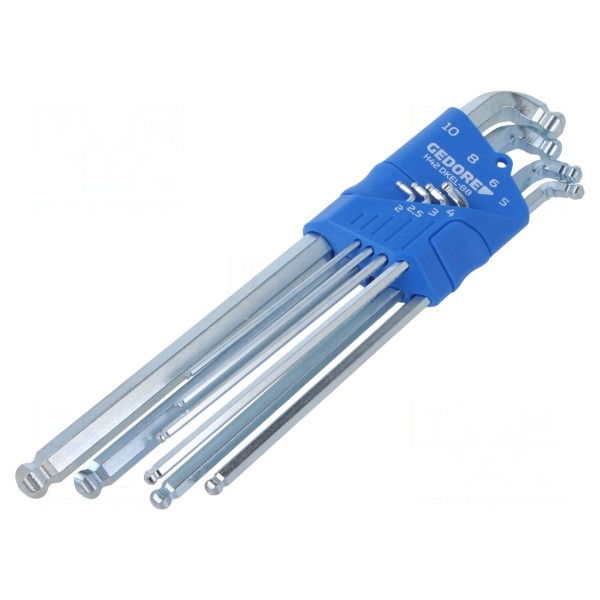 Zestaw kluczy typu imbus zawiera osiem końcówek o zróżnicowanych rozmiarach metrycznych. W komplecie znajdują się klucze HEX w wymiarach 2mm, 2,5mm, 3mm, 4mm, 5mm, 6mm, 8mm oraz 10mm.