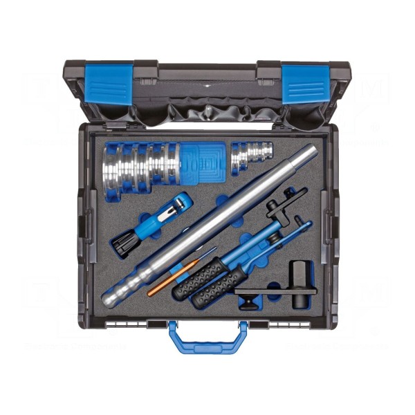 W zestawie: matryca (10 sztuk), obcinak do rur. Narzędzia znajdują zastosowanie w pracach instalacyjnych wymagających precyzyjnego kształtowania rur o różnych średnicach w podanym zakresie wymiarowym.