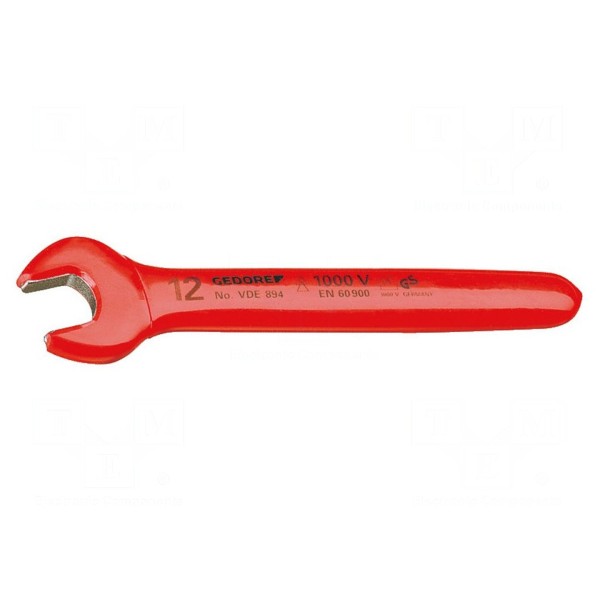 Klucz płaski GEDORE o rozmiarze 12 mm to izolowane narzędzie jednostronne. Produkt został wykonany ze stali chromowo-wanadowej, co zapewnia parametry techniczne wymagane w pracach wymagających ochrony przed porażeniem prądem elektrycznym.