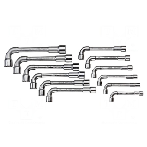 Zestaw zawiera 12 kluczy rurowych marki GEDORE. Komplet przeznaczony jest do prac montażowych wymagających użycia narzędzi o specjalistycznym kształcie pozwalającym na pracę w miejscach o ograniczonej przestrzeni.