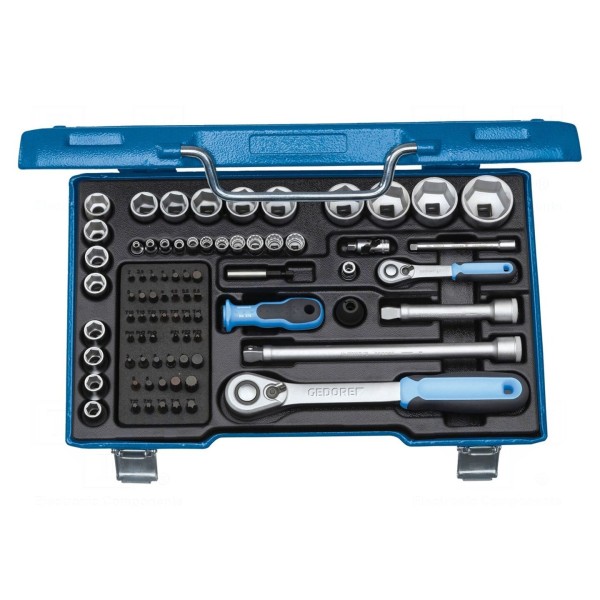 W skład kompletu wchodzą dwie grzechotki o rozmiarach 1/2" oraz 1/4", które zapewniają odpowiednią dźwignię i manewrowość w zależności od obciążenia. Wyposażenie obejmuje również nasadki 6-kątne 1/2", nasadki 12-kątne 1/4", adaptery oraz przedłużacze do końcówek nasadowych. W zestawie: adapter, grzechotka 1/2", grzechotka 1/4", końcówki wkrętakowe, nasadki 6-kątne 1/2", nasadki 12-kątne 1/4", przedłużacz do końcówek nasadowych.