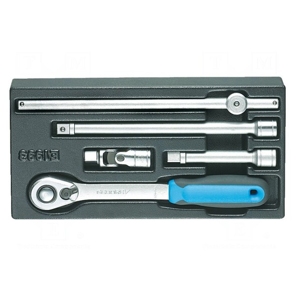 Całość dostarczana jest we wkładce z tworzywa, która ułatwia organizację narzędzi w skrzynkach warsztatowych. Konstrukcja zestawu zapewnia dopasowanie do standardowych napędów 1/2".