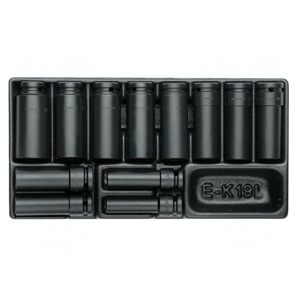 Elementy kompletu zostały umieszczone w praktycznej wkładce z tworzywa, która pozwala na organizację i przechowywanie narzędzi. Konstrukcja nasadek umożliwia stosowanie ich z urządzeniami udarowymi.