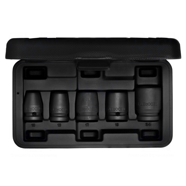 Zestaw zawiera 5 sztuk kluczy nasadowych udarowych. Narzędzia zostały zaprojektowane do pracy z uchwytami o rozmiarze 1/2 cala.
