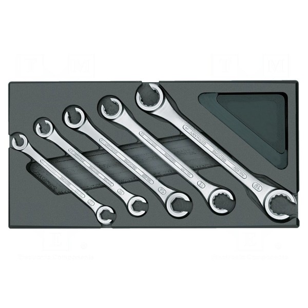 Zestaw zawiera pięć kluczy oczkowych półotwartych płaskich, które zostały zaprojektowane do prac montażowych oraz serwisowych. Narzędzia te umożliwiają obsługę połączeń śrubowych w miejscach o utrudnionym dostępie.