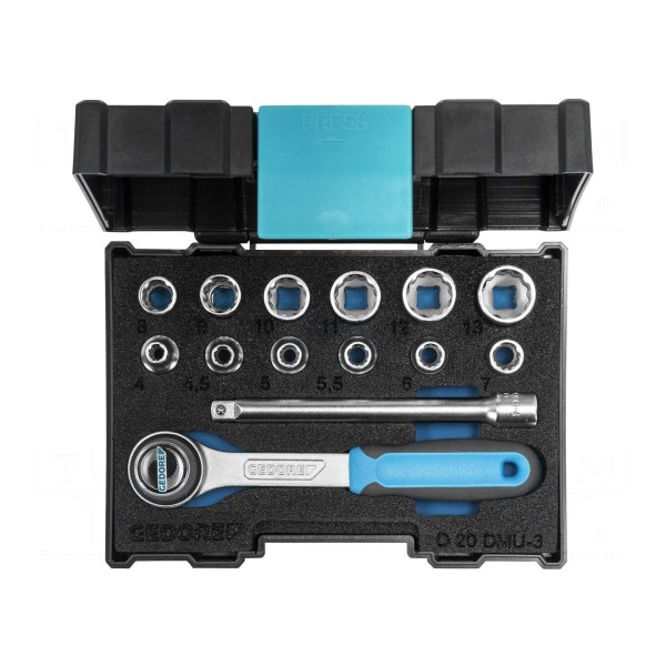 Zestaw narzędzi składa się z 14 elementów, w tym grzechotki oraz kluczy nasadowych. Całość została wykonana ze stali chromowo-wanadowej, co zapewnia parametry techniczne wymagane przy pracy z elementami złącznymi.