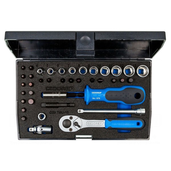 Zestaw narzędziowy GEDORE składa się z 40 elementów, obejmujących grzechotkę oraz nasadki. Komplet jest przystosowany do pracy z narzędziami o gnieździe uchwytu w rozmiarze 1/4".