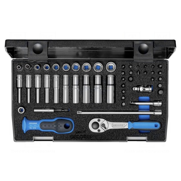 Zestaw narzędziowy GEDORE obejmuje grzechotkę oraz klucze nasadowe. Komplet został zaprojektowany do prac montażowych z wykorzystaniem gniazda uchwytu o rozmiarze 1/4".