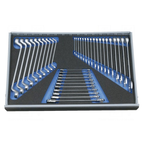 Zestaw zawiera 39 kluczy typu oczkowego oraz płasko-oczkowego. Komplet został zaprojektowany w celu zapewnienia dostępu do zróżnicowanych rozmiarów narzędzi ręcznych niezbędnych podczas prac montażowych i serwisowych.