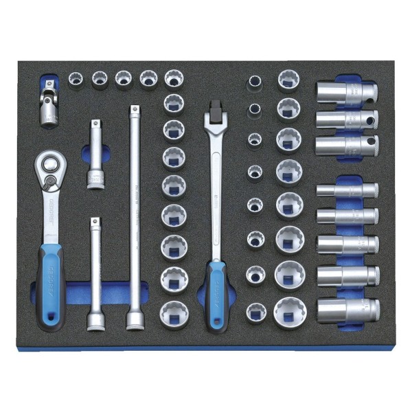 Całość kompletu dostarczana jest we wkładce piankowej, która umożliwia uporządkowane przechowywanie narzędzi. Zestaw składa się z 43 sztuk komponentów dostosowanych do standardowych zadań warsztatowych.