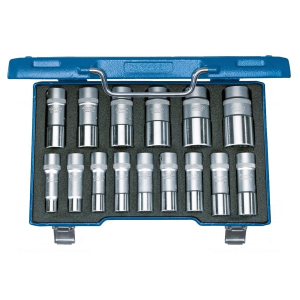 Zestaw narzędzi składa się z 15 elementów, w skład których wchodzą klucze nasadowe oraz grzechotka. Całość przystosowana jest do pracy z gniazdami o rozmiarze 1/2".
