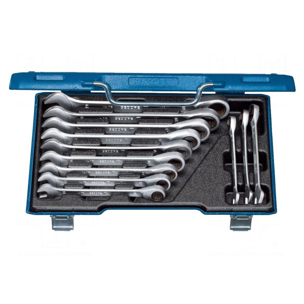 Zestaw zawiera dwanaście kluczy płasko-oczkowych o różnej wielkości. Narzędzia te przeznaczone są do pracy ze śrubami i nakrętkami o standardowych profilach.
