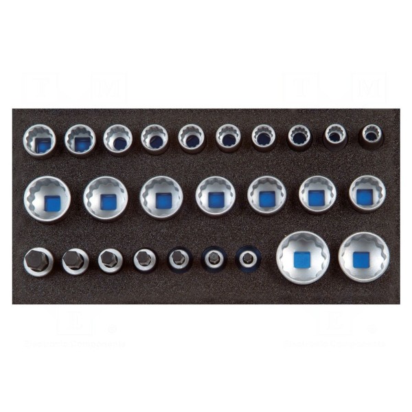Narzędzia dostarczane są w wygodnej wkładce piankowej, co ułatwia organizację oraz przechowywanie poszczególnych części zestawu. Konstrukcja elementów zapewnia współpracę z uchwytami w standardzie 1/2".