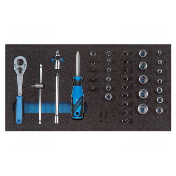 Całość kompletu dostarczana jest we wkładce piankowej, która ułatwia organizację oraz przechowywanie narzędzi wewnątrz skrzyń lub wózków narzędziowych. Zestaw dedykowany jest do prac wymagających precyzyjnych połączeń śrubowych z wykorzystaniem napędów 1/4".
