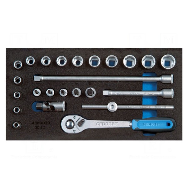 Zestaw narzędzi obejmuje 24 elementy, w tym grzechotkę oraz klucze nasadowe typu Torx. Konstrukcja narzędzi przystosowana jest do pracy z gniazdami uchwytu w rozmiarze 3/8".
