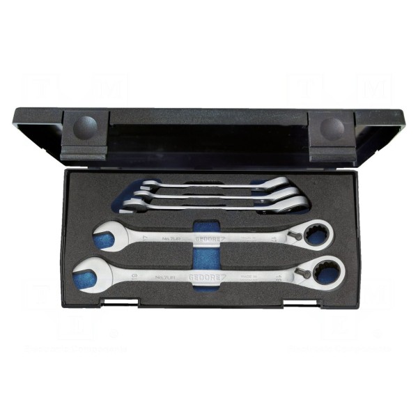 Zestaw zawiera pięć kluczy płasko-oczkowych wyposażonych w mechanizm grzechotkowy. Narzędzia łączą funkcjonalność klucza płaskiego oraz oczkowego z mechanizmem zapadkowym, co umożliwia pracę w miejscach o ograniczonej przestrzeni.