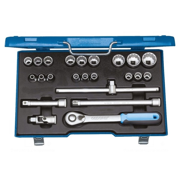 Zestaw narzędzi obejmuje klucze nasadowe oraz grzechotkę z mocowaniem 1/2 cala. Komplet składa się z 23 elementów, umożliwiających obsługę połączeń gwintowanych w szerokim zakresie prac montażowych i serwisowych.