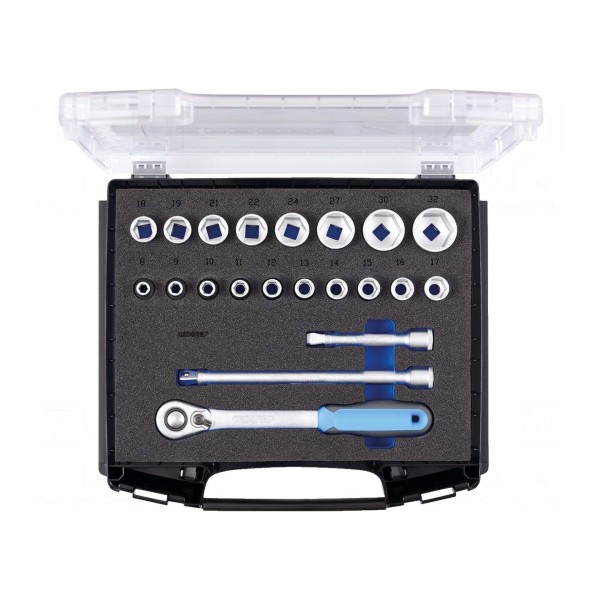 W skład zestawu wchodzą końcówki o profilu 6-kątnym oraz mechanizm z grzechotką. Całość stanowi kompletny pakiet narzędzi nasadowych dedykowanych do obsługi połączeń śrubowych.