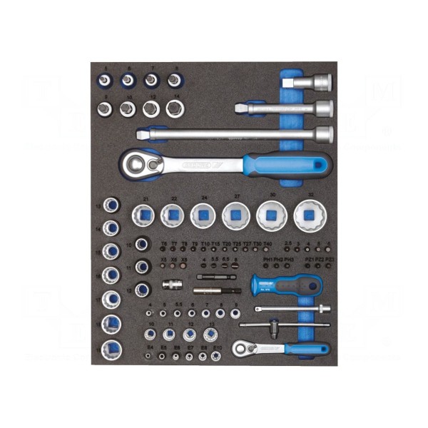 Całość przechowywana jest we wkładce piankowej, która umożliwia uporządkowane przechowywanie elementów i łatwą kontrolę ich dostępności podczas pracy. Zastosowane rozwiązania konstrukcyjne sprawiają, że komplet jest przystosowany do częstego użytku w warunkach warsztatowych.