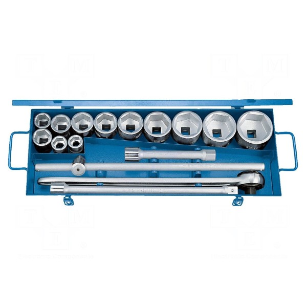 Zestaw narzędzi składa się z 16 elementów przeznaczonych do prac montażowych i serwisowych. Komplet zawiera nasadki 6-kątne oraz grzechotkę, umożliwiając obsługę połączeń śrubowych o dużych wymaganiach siłowych. Narzędzia wyposażono w gniazdo o rozmiarze 3/4".