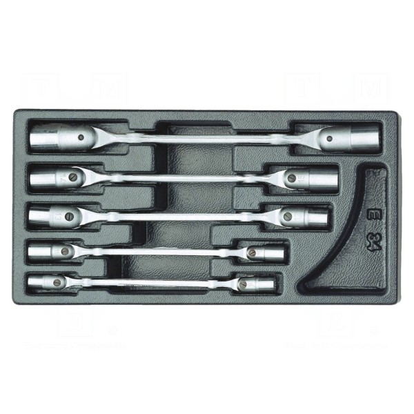 Zestaw zawiera 5 kluczy nasadowych przeznaczonych do prac montażowych. Narzędzia zostały uporządkowane w dedykowanej wkładce z tworzywa, która ułatwia przechowywanie i organizację elementów zestawu.