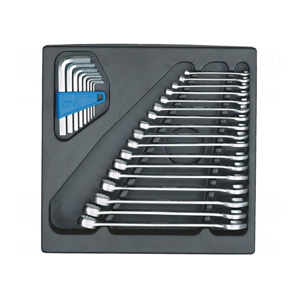 Elementy zestawu zostały dobrane pod kątem uniwersalnego zastosowania w warsztacie. Dzięki zastosowaniu wkładki z tworzywa, klucze są zabezpieczone przed przemieszczaniem się i mogą być przechowywane w szufladach wózków narzędziowych.