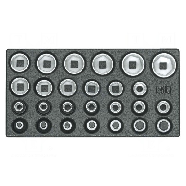 Zestaw zawiera klucze nasadowe 6-kątne, dostosowane do pracy z narzędziami wyposażonymi w uchwyt o rozmiarze 1/2". Komplet obejmuje końcówki nasadowe zaprojektowane do współpracy z gniazdami o standardowym napędzie calowym.