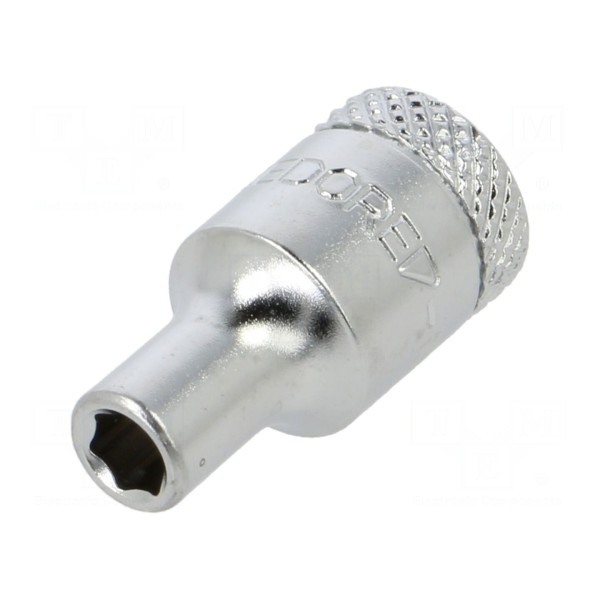 Nasadka 6-kątna o rozmiarze 4mm przeznaczona jest do pracy z narzędziami wyposażonymi w zabierak 1/4". Produkt został wykonany ze stali narzędziowej i wykończony powłoką chromową.