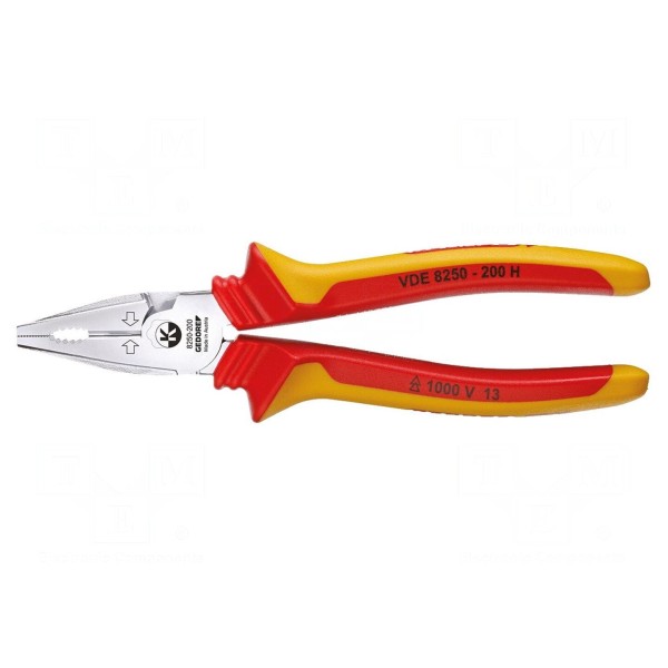Szczypce uniwersalne o długości 200mm wykonane ze stali. Konstrukcja narzędzia obejmuje ostrza hartowane indukcyjnie, które osiągają twardość w zakresie 62–64 HRC, co umożliwia cięcie drutu sprężynowego o średnicy do 2,2mm.