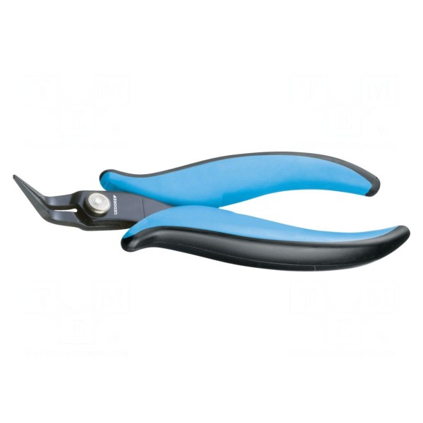 Szczypce precyzyjne GEDORE o długości 150 mm charakteryzują się konstrukcją z odgiętą główką, co ułatwia dostęp do elementów w trudno dostępnych miejscach. Główka szczypiec odgięta jest pod kątem 45°, co umożliwia wygodną pracę przy montażu drobnych podzespołów.
