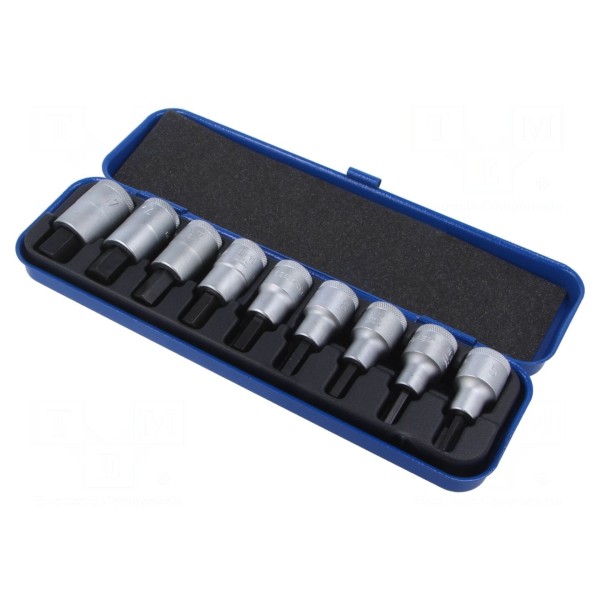 Zestaw zawiera dziewięć końcówek nasadowych typu imbus, przeznaczonych do prac montażowych i warsztatowych. W skład kompletu wchodzą elementy o rozmiarach grota: 5mm, 6mm, 8mm, 9mm, 10mm, 12mm, 14mm oraz 17mm.