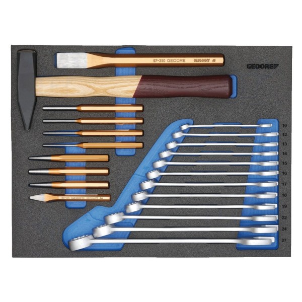 Komplet został zaprojektowany z myślą o wyposażeniu wózków warsztatowych, co usprawnia organizację pracy i dostęp do przyrządów. W zestawie: dłuto, młotek.