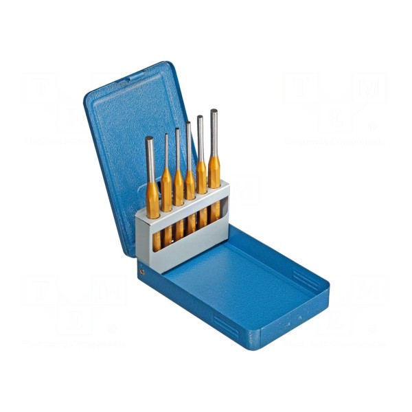 Zestaw narzędzi typu przebijaki marki GEDORE zawiera 6 elementów. Narzędzia umieszczone są w metalowym pojemniku, który służy do ich przechowywania i transportu.