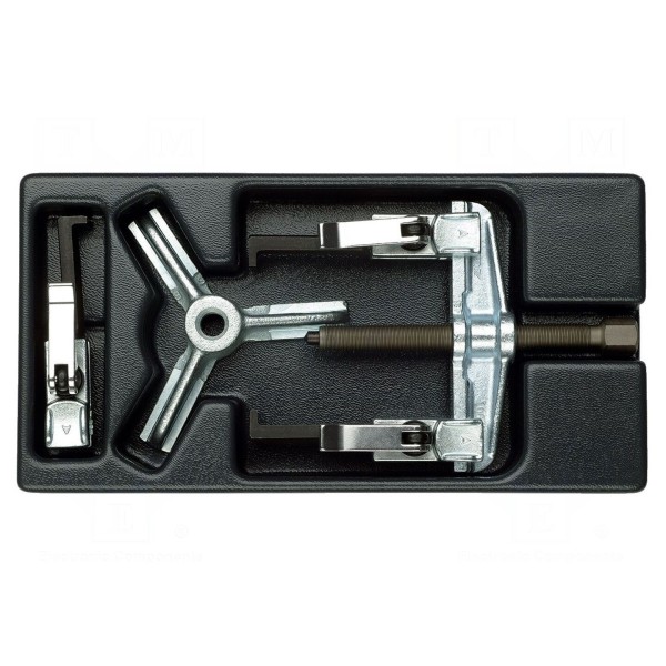 Zestaw narzędzi typu ściągacz do łożysk umożliwia pracę z wykorzystaniem dwóch lub trzech ramion. Konstrukcja pozwala na dopasowanie narzędzia do konkretnych zadań demontażowych w zależności od potrzeb użytkownika. Całość kompletu dostarczana jest w dedykowanej wkładce piankowej, co ułatwia organizację przestrzeni roboczej oraz przechowywanie elementów zestawu. Produkt przeznaczony jest do demontażu łożysk w ramach prac warsztatowych.