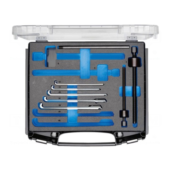 Całość zestawu jest przechowywana w walizce, która ułatwia organizację oraz transport elementów. W zestawie: ściągacz do łożysk, walizka.