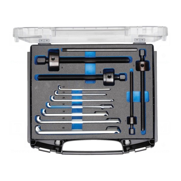 Zestaw narzędzi specjalistycznych przeznaczony do prac związanych z demontażem łożysk. Komplet obejmuje łącznie 37 elementów niezbędnych do obsługi różnych rozmiarów łożysk.