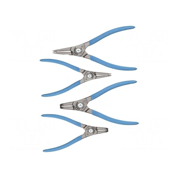 W komplecie znajdują się cztery elementy typu szczypce. Zestaw przystosowany jest do prac wymagających precyzyjnego operowania na pierścieniach osadczych wewnętrznych i zewnętrznych.