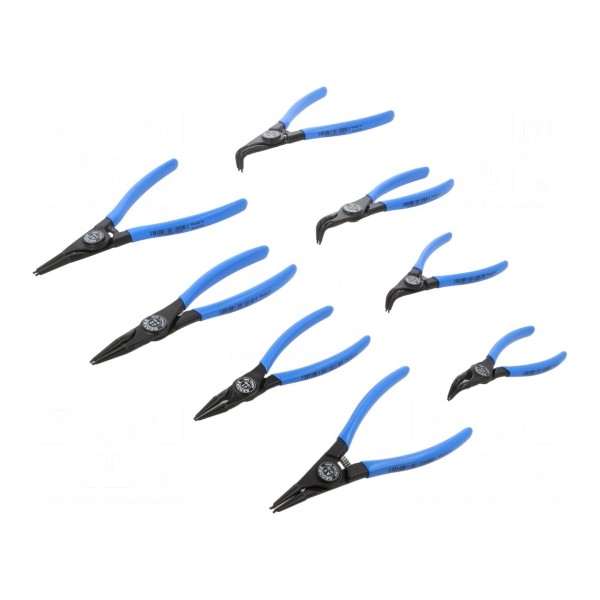 Zestaw zawiera 8 sztuk szczypiec przeznaczonych do montażu oraz demontażu pierścieni osadczych zarówno wewnętrznych, jak i zewnętrznych. Narzędzia występują w różnych wersjach konstrukcyjnych, obejmujących modele proste oraz kątowe, co pozwala na dopasowanie do specyfiki wykonywanych prac montażowych.