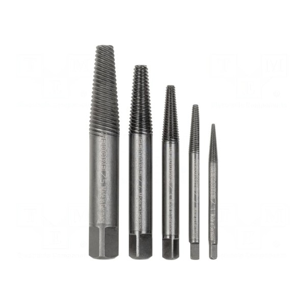 Zestaw zawiera wykrętaki przeznaczone do usuwania uszkodzonych elementów złącznych o gwintach w zakresie od M3 do M18. Komplet składa się z 5 sztuk narzędzi o różnych rozmiarach, co pozwala na dopasowanie odpowiedniego wykrętaka do zniszczonego gwintu.