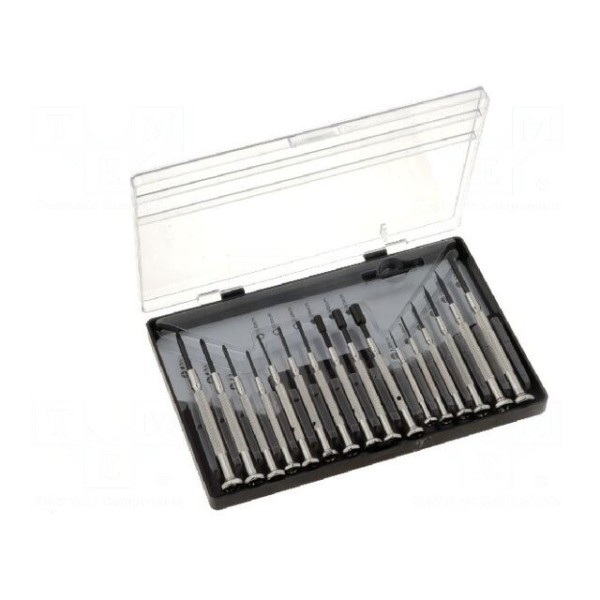 Zestaw wkrętaków precyzyjnych zawiera 16 elementów przeznaczonych do prac wymagających dużej dokładności. Narzędzia wyposażono w hartowane ostrza wykonane ze stali, których końcówki zostały poddane procesowi czernienia. Konstrukcja rękojeści z chromowanym wykończeniem posiada żłobkowania poprawiające chwyt oraz obrotową nasadkę ułatwiającą pracę manualną.