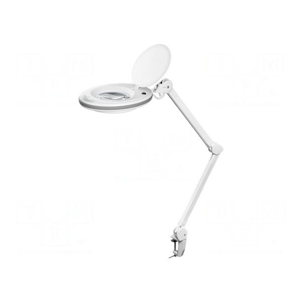 Konstrukcja w kolorze białym przeznaczona jest do zasilania napięciem 230 V AC przy wykorzystaniu złączy standardu europejskiego. Urządzenie sprawdzi się w pracach wymagających precyzyjnego oświetlenia oraz powiększenia obserwowanego obszaru w warunkach warsztatowych lub laboratoryjnych.